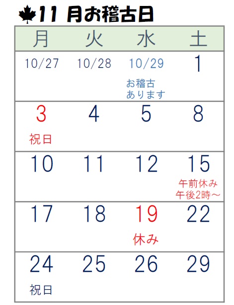 ・10月29日(水)お稽古いたします。年間予定表ではお休みとしておりましたが、変更いたします。